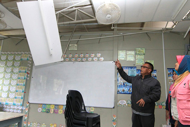 Guru Besar SK Mesilow, Kudasang menunjukkan siling yang hampir runtuh akibat gempa di salah sebuah kelas di sekolahnya - Sumber Gambar Nor Farhana