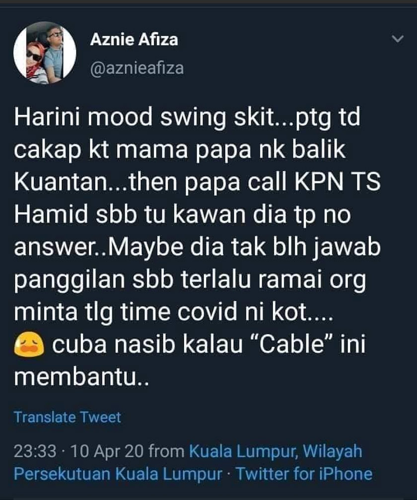 "Mungkin dia (Abdul Hamid) tidak boleh jawab panggilan sebab terlalu ramai orang minta tolong masa COVID-19, cuba nasib kalau 'cable' ini membantu," tulis Aznie di Twitter.