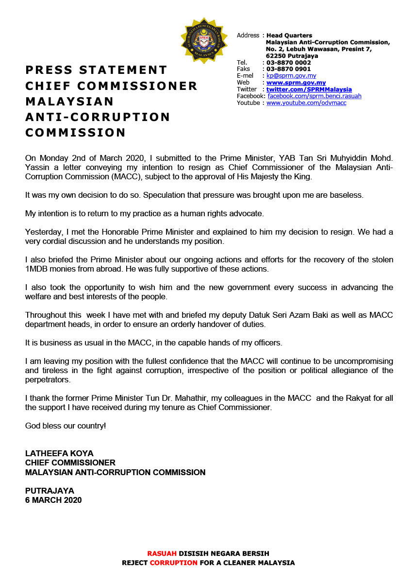 Latheefa berkata tindakan itu merupakan keputusannya sendiri dan menafikan spekulasi yang beliau menerima tekanan untuk meletak jawatan.