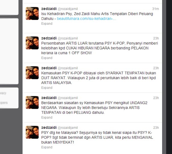 Memberikan kenyataannya menerusi akaun Twitter miliknya di @rozaidijamil, pelakon itu mengakui dia bersama pasukannya telah pun menjalankan siasatan terhadap proses kemasukan Psy ke negara ini yang telah dilakukan berlandaskan undang-undang negara.