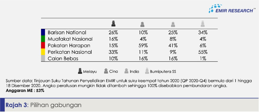 Tinjauan EMIR Research yang diadakan di tengah-tengah pandemik (Q4 2020) telah menunjukkan bahawa masyarakat Melayu adalah yang paling tersebar dalam pilihan politik mereka (Rajah 3).