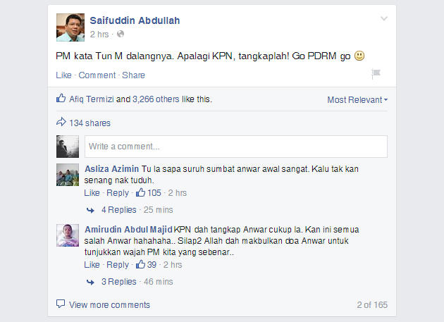 Status di laman Facebook Saifuddin yang menggesa PDRM untuk segera menangkap Dr Mahathir - Sumber: Facebook Saifuddin