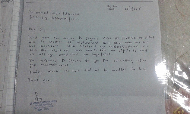 Surat kepada ibu Adib yang memintanya merujuk kepada kaunselor kerana gangguan emosi selepas pembedahan membuang mata anaknya - Foto Jaswan Mulop