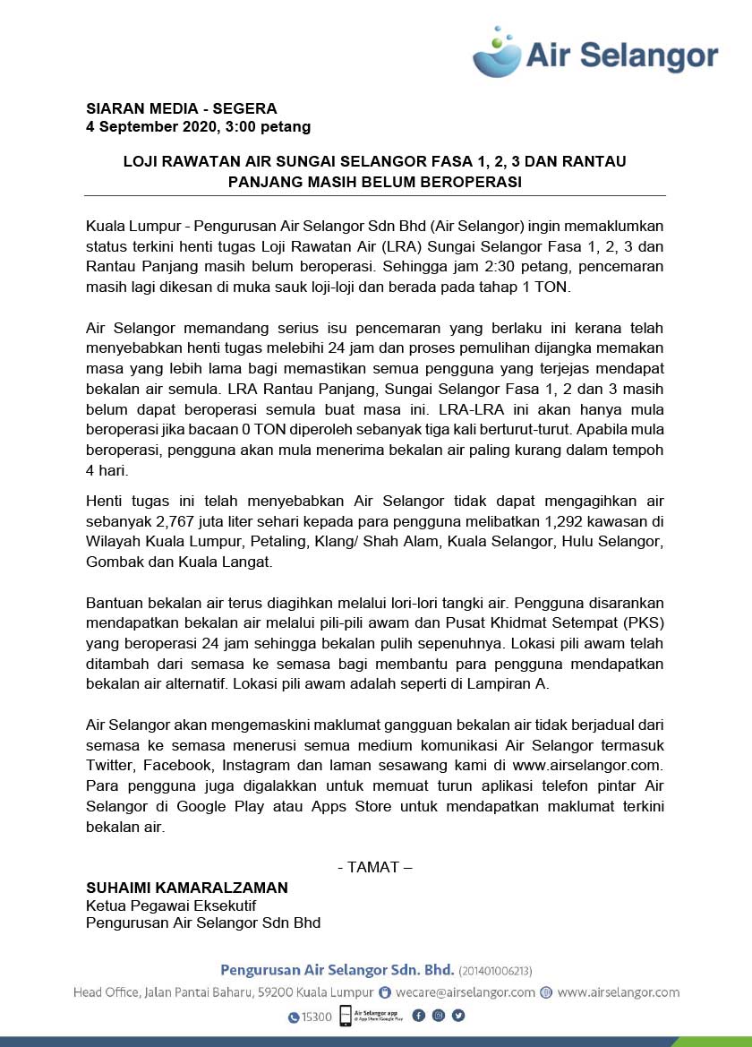"Air Selangor memandang serius isu pencemaran yang berlaku ini kerana telah menyebabkan henti tugas melebihi 24 jam dan proses pemulihan dijangka memakan masa yang lebih lama bagi memastikan semua pengguna yang terjejas mendapat bekalan air semula.