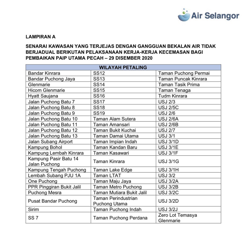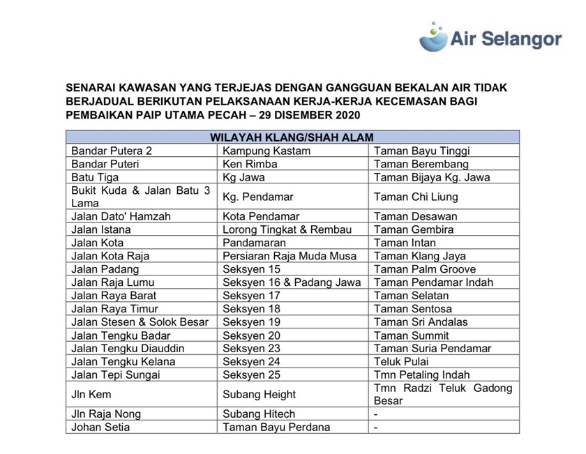 “Penutupan bekalan air tidak berjadual ini akan menjejaskan 58 kawasan di Wilayah Klang, Shah Alam dan 72 kawasan di Wilayah Petaling.