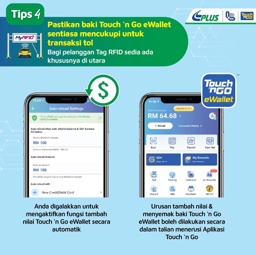 Pastikan baki Touch ‘n Go eWallet sentiasa mencukupi untuk pembayaran tol seterusnya menikmati perjalanan yang lancar ketika melalui plaza tol.