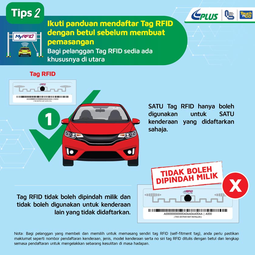 Sila pastikan Tag RFID dipasang mengikut panduan yang betul, sama ada di lampu hadapan atau cermin hadapan pada bahagian kiri kenderaan untuk menikmati pengalaman perjalanan yang lebih lancar dan selesa.