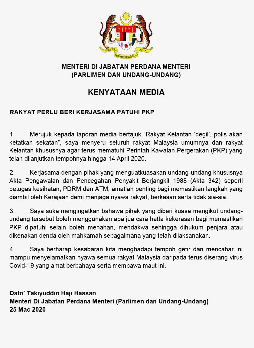 Takiyuddin menyeru seluruh rakyat Malaysia agar terus mematuhi PKP yang telah dilanjutkan tempohnya sehingga 14 April.