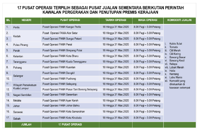 Orang ramai boleh mendapatkan barang keperluan di 17 Pusat Operasi terpilih sebagai pusat jualan sementara berikutan Perintah Kawalan Pergerakan dan Penutupan Premis Kerajaan. Senarai 17 pusat operasi terpilih seperti yang dilampirkan di bawah.