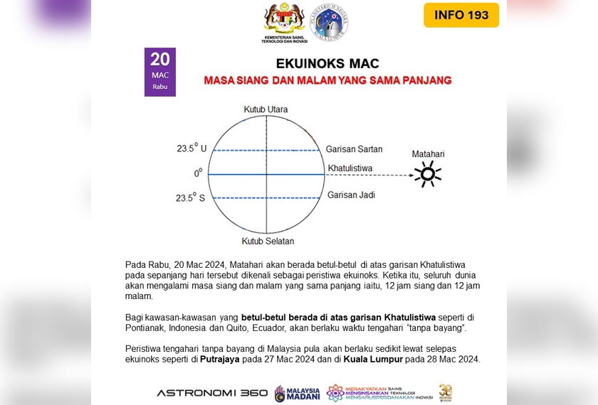 KEMENTERIAN Sains, Teknologi dan Inovasi kini berkongsi peristiwa ekuinoks yang akan berlaku pada minggu ini.