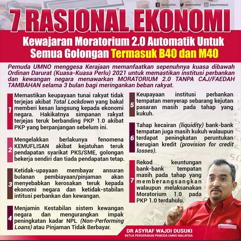 Selain tujuh rasional itu, Pemuda UMNO turut menggesa kerajaan untuk mengarahkan agensi-agensi pembiayaan dan kredit milik kerajaan yang memberi fokus kepada golongan B40 dan Perusahaan Mikro seperti MARA, TEKUN, Amanah Ikhtiar Malaysia (AIM) dan SME Bank untuk melaksanaan moratorium bagi peserta-peserta program mereka.