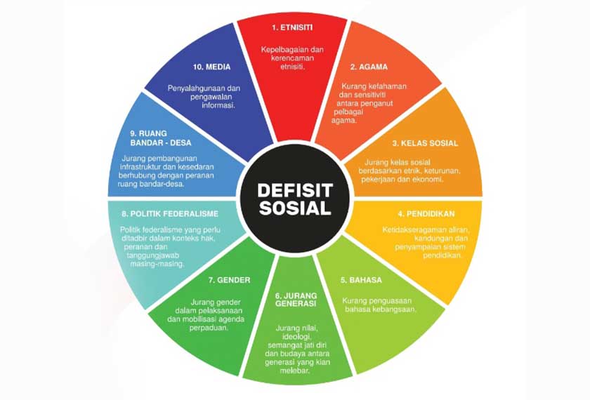 Sepuluh defisit sosial ini meliputi etnisiti, agama, kelas sosial, pendidikan, bahasa, jurang generasi, gender, politik federalism, ruang bandar-desa dan media. (Rujuk Foto 1: Defisit Sosial. Sumber: Laporan Dasar Perpaduan Negara, 2021)