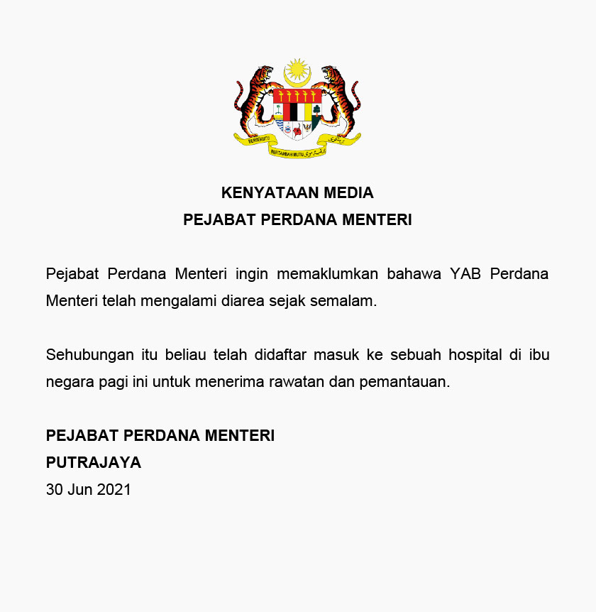 Pejabat Perdana Menteri (PMO) memaklumkan Muhyiddin mengalami diarea sejak semalam.