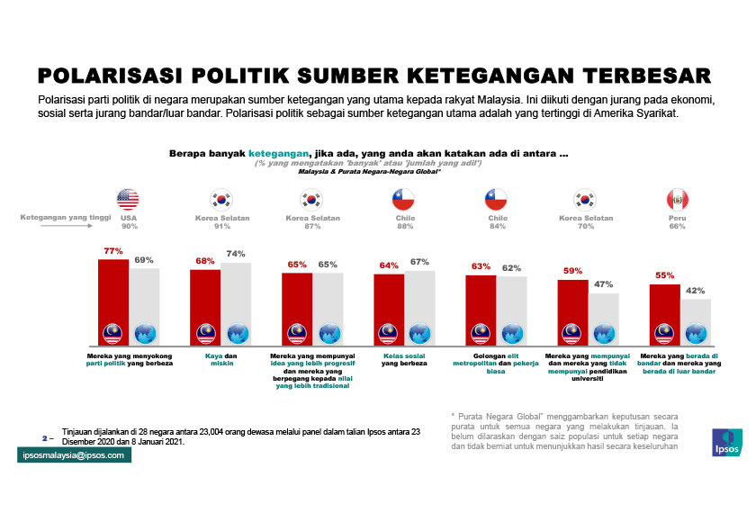 Kajian juga mendapati polarisasi politik sebagai sumber ketegangan utama adalah yang tertinggi di Amerika Syarikat.