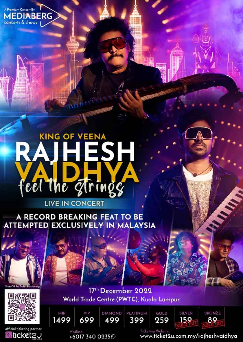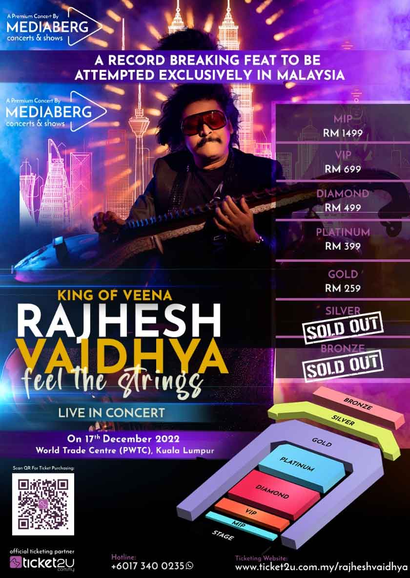 Mereka yang mahu membeli tiket ke konsert Rajhesh Vaidhya yang lebih dikenali sebagai King of Veena itu di World Trade Centre pada 17 Disember ini boleh melayari www.ticket2u.com.my/rajheshvaidhya atau menghubungi penganjur di talian 017-340 0235.