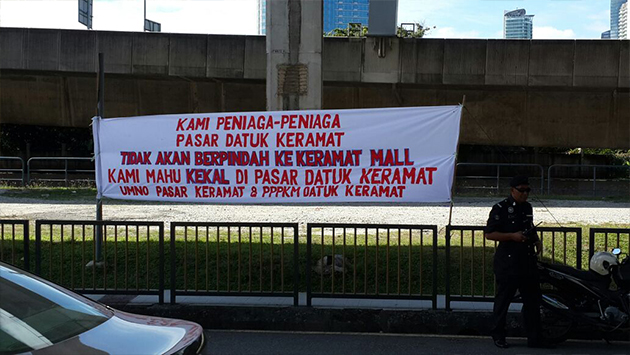 Sepanduk besar membantah arahan pindah dipasang di hadapan Keramat Mall oleh peniaga Pasar Keramat - Gambar Astro AWANI