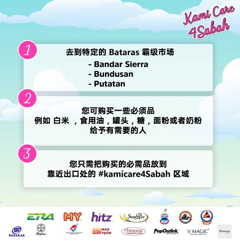 Katanya, kempen #KamiCare4Sabah dianjurkan di tiga pasar raya besar Bataras terpilih iaitu Bataras Bandar Sierra, Bataras Bundusan dan Bataras Putatan.