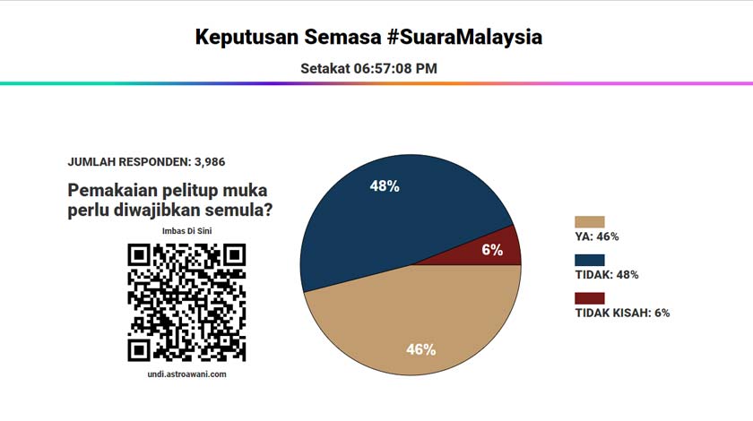 Sehingga pukul 6.57 petang tadi, sebanyak 48 peratus daripada 3,986 responden #SuaraMalaysia tidak bersetuju agar pemakaian pelitup muka diwajibkan semula di negara ini.