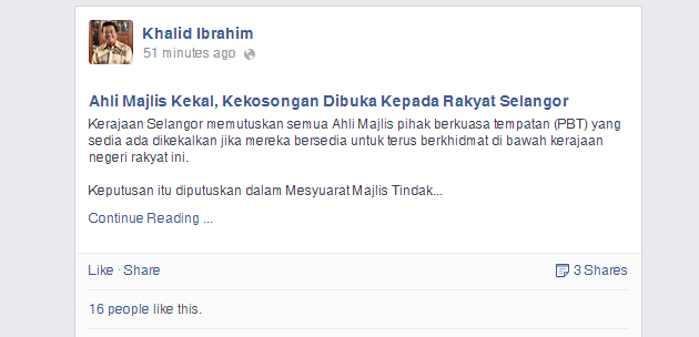 Dalam posting terbaru Facebook Menteri Besar Selangor, Tan Sri Abdul Khalid Ibrahim, Kerajaan Selangor memutuskan semua Ahli Majlis pihak berkuasa tempatan (PBT) yang sedia ada dikekalkan jika mereka bersedia untuk terus berkhidmat di bawah kerajaan negeri rakyat itu.