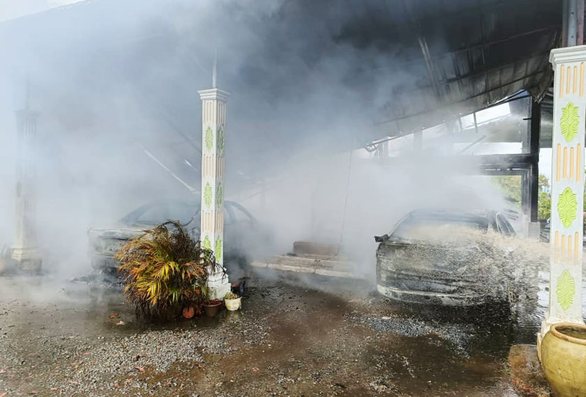 JITRA: Tiga buah kereta serta dua buah motosikal musnah dalam kebakaran sebuah rumah di Kampung Pida 4, dekat sini, pada Sabtu.