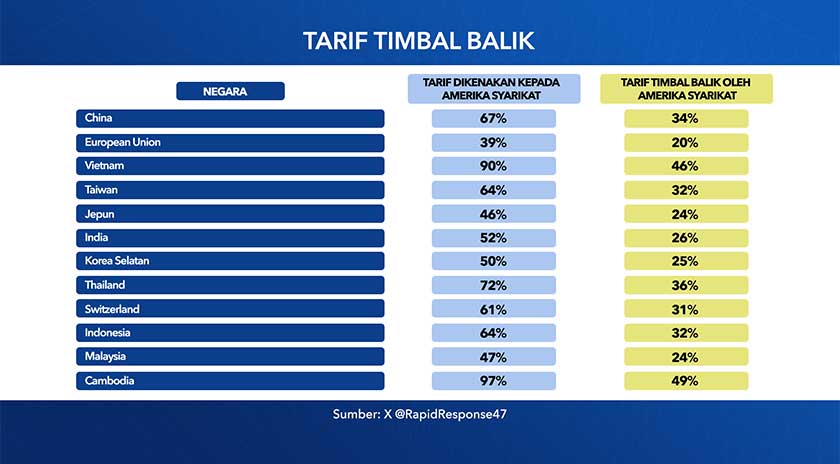 Antara tarif timbal balik yang tinggi dikenakan terhadap China sebanyak 34 peratus, Kesatuan Eropah 20 peratus, Vietnam 46 peratus, Sri Lanka 44 peratus, Kemboja 49 peratus, Laos 48 peratus dan Myanmar 44 peratus.