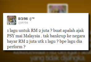“@IAY94 1 lagu untuk RM 2 juta? buat apalah ajak PSY mai Malaysia . tak bankrup ke negara bayar RM 2 juta utk 1 lagu ? bpe lagu dia perform?”