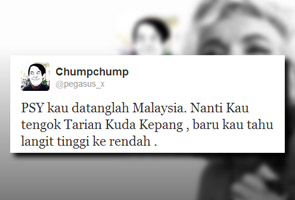 “@pegasus_x: PSY kau datanglah Malaysia. Nanti Kau tengok Tarian Kuda Kepang , baru kau tahu langit tinggi ke rendah."