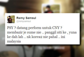 “@remysamsul: PSY ? datang perform untuk CNY ? membazir je sume nie .. panggil siti ke , yuna ke dah lah .. nk korea2 nie pahal .. ini Malaysia.”