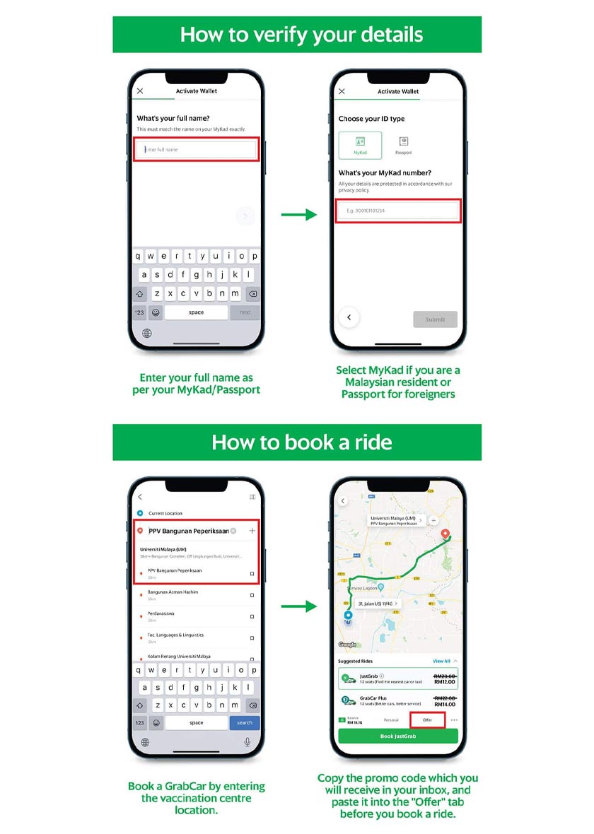 Program vaksinasi untuk warga emas oleh Grab ini dibangunkan bagi memudahkan akses perjalanan menerusi aplikasi Grab. Bagi mereka yang telah menerima janji temu vaksinasi COVID-19, mereka boleh menempah perkhidmatan Grab dengan hanya beberapa langkah mudah: