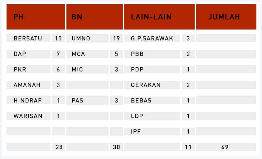 Buat masa kini, Pakatan Harapan (PH) iaitu gabungan Parti Pribumi Bersatu Malaysia (Bersatu), DAP, Parti Warisan Sabah (Warisan) dan Pertubuhan Pasok Momogun Kadazandusun Murut Bersatu (UPKO) menguasai Dewan Rakyat.