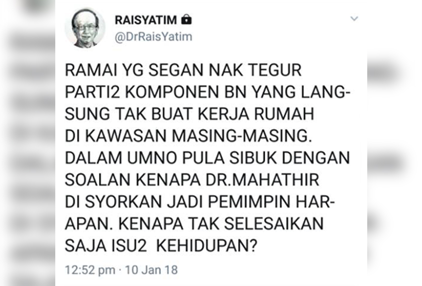 Catatan terbaharu di laman Twitter Rais mahu pemimpin UMNO tidak terlalu sibuk dengan isu Dr Mahathir yang mahu menjadi pemimpin. - Sumber gambar Twitter @DrRaisYatim
