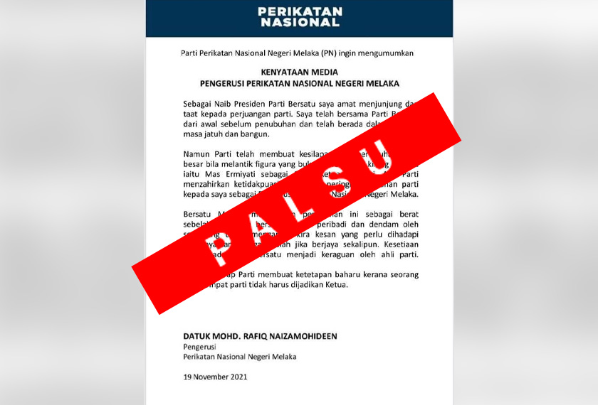 TELOK MAS: Kenyataan media kononnya Pengerusi Perikatan Nasional (PN) Melaka, Datuk Mohd Rafiq Naizamohideen membantah keputusan pucuk pimpinan menamakan Datuk Mas Ermieyati Samsudin sebagai calon Ketua Menteri disahkan palsu.