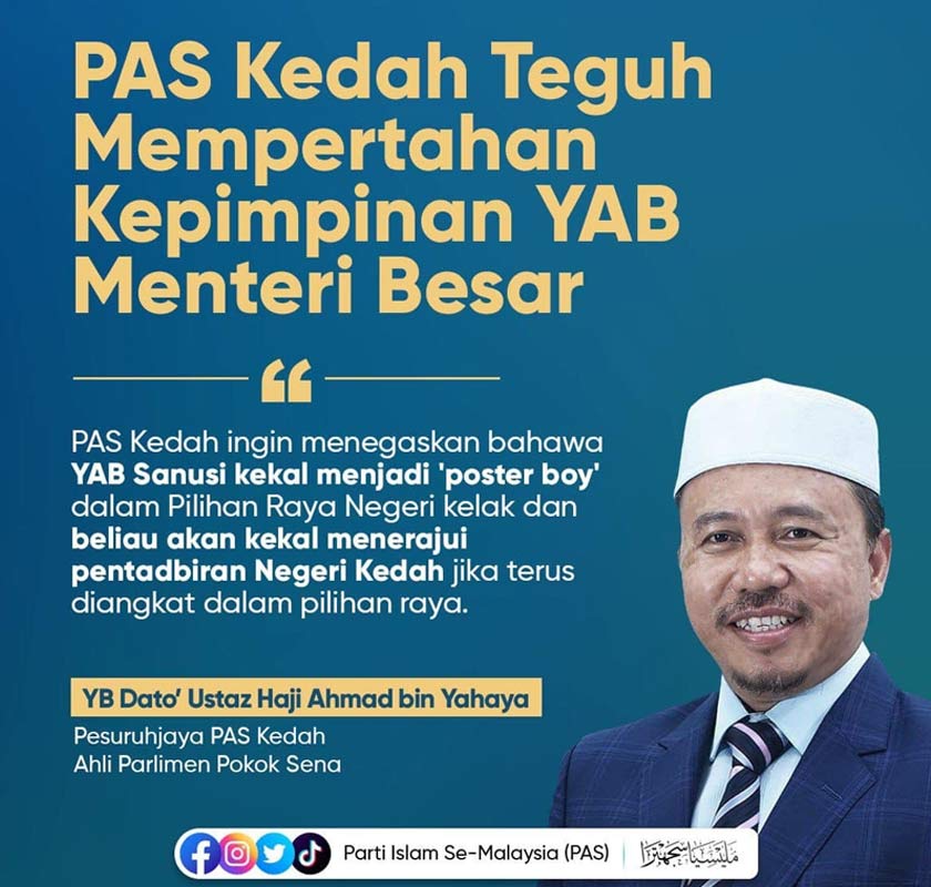 "Pas Kedah ingin menegaskan bahawa Muhammad Sanusi kekal menjadi 'poster boy' dalam PRN kelak dan beliau akan kekal menerajui pentadbiran Kedah jika terus diangkat dalam PRN.