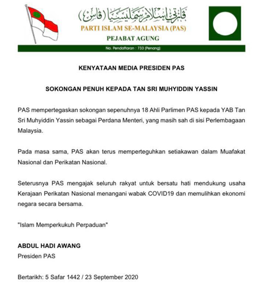Presiden Pas, Datuk Seri Abdul Hadi Awang menegaskan kesemua 18 ahli Parlimen parti itu menyokong penuh Tan Sri Muhyiddin Yassin sebagai Perdana Menteri yang sah mengikut Perlembagaan.