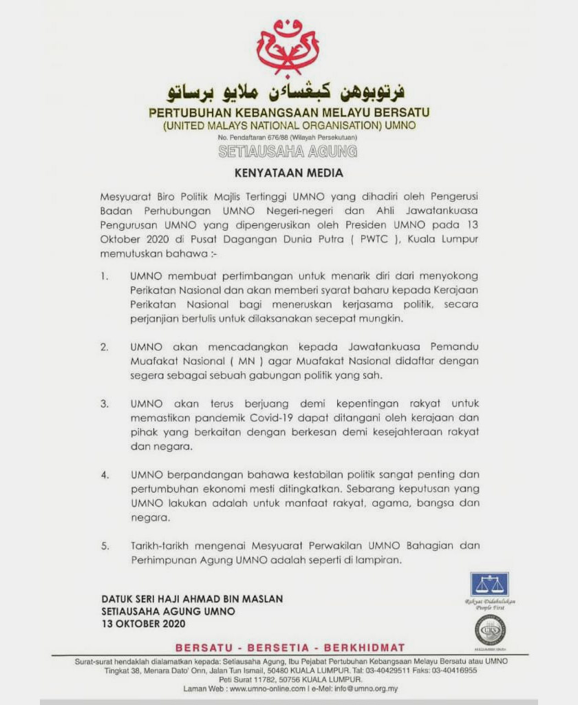 Setiausaha Agungnya, Datuk Seri Ahmad Maslan, berkata UMNO memberi syarat baharu kepada kerajaan PN jika mahu meneruskan kerjasama politik secara perjanjian bertulis untuk dilaksanakan secepat mungkin.