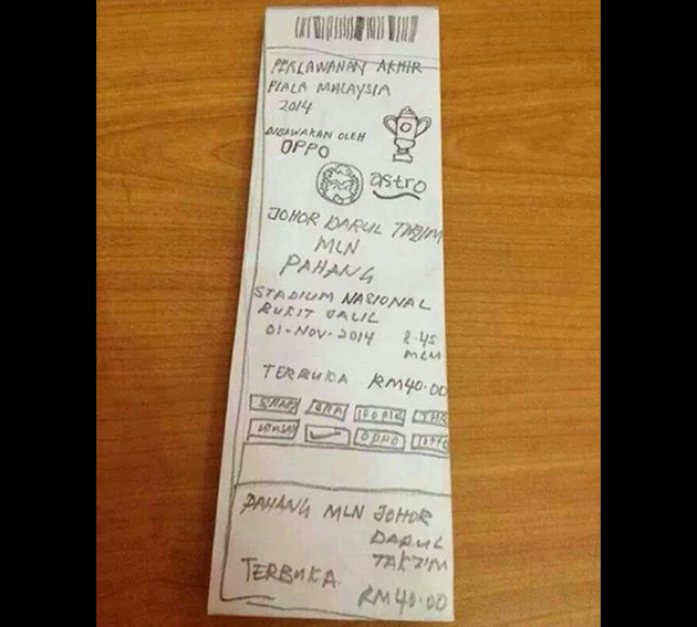 Tiket perlawanan akhir Piala Malaysia JDT menentang Pahang yang menjadi bahan jenaka dan tersebar di beberapa kumpulan WhatsApp - Gambar Astro AWANI