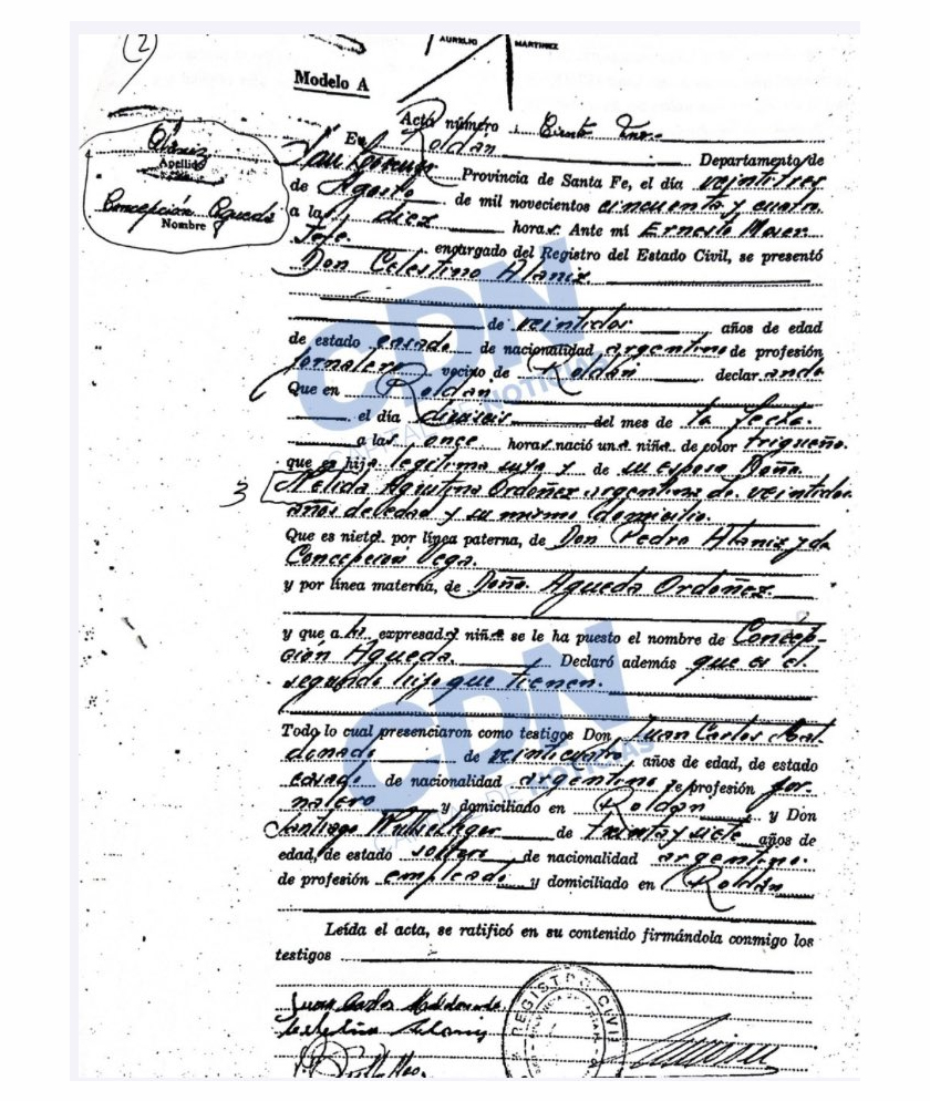 Rekod tersebut menunjukkan bahawa neneknye, Concepcion Agueda, dilahirkan di bandar Roldan, Jabatan San Lorenzo, Argentina, pada 16 Ogos 1954.