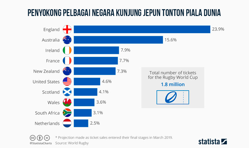 Untuk perlawanan akhir pada Sabtu hadapan, England akan disorak paling ramai penyokong. Statistik menunjukkan hampir 25 peratus dari 1.8 juta tiket untuk keseluruhan pelawanan sepanjang RWC 2019 telah dibeli secara atas talian oleh peminat dari England.