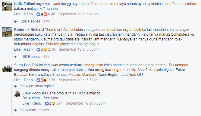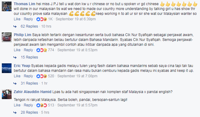 "Hei Miss JPJ, anda bercakap bahasa Mandarin sangat bagus. Tahniah!" tulis Thomas Lim.