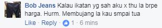 "Kalau ikatan yang sah aku tak tahulah berapa harga. Hurm. Membujanglah kau sampai tua," perli Bob Jeans.