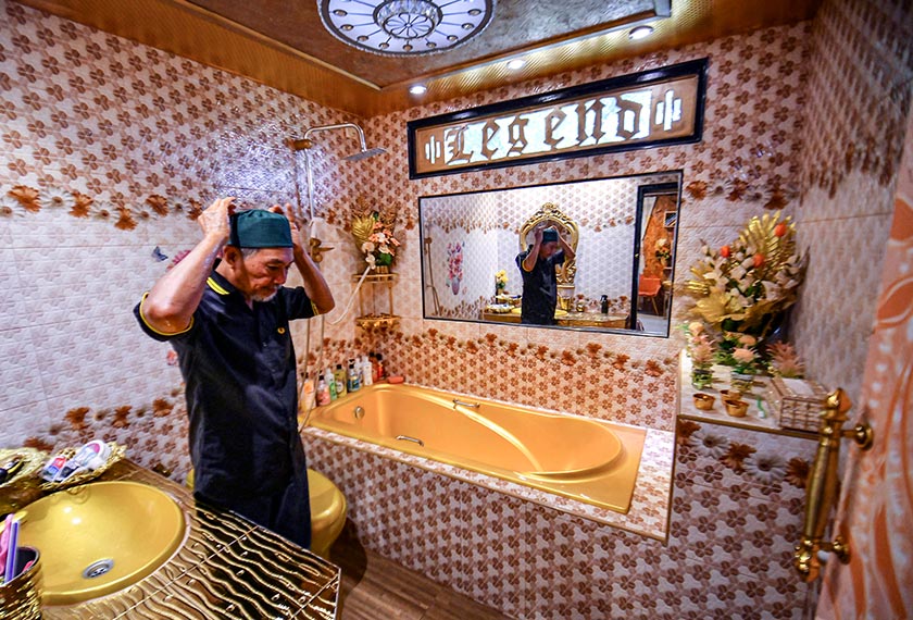 Selain tandas mewah dengan rona emas, pondok itu juga mempunyai ruang bacaan, sebuah katil, penyaman udara, sistem audio dan ruang komputer.